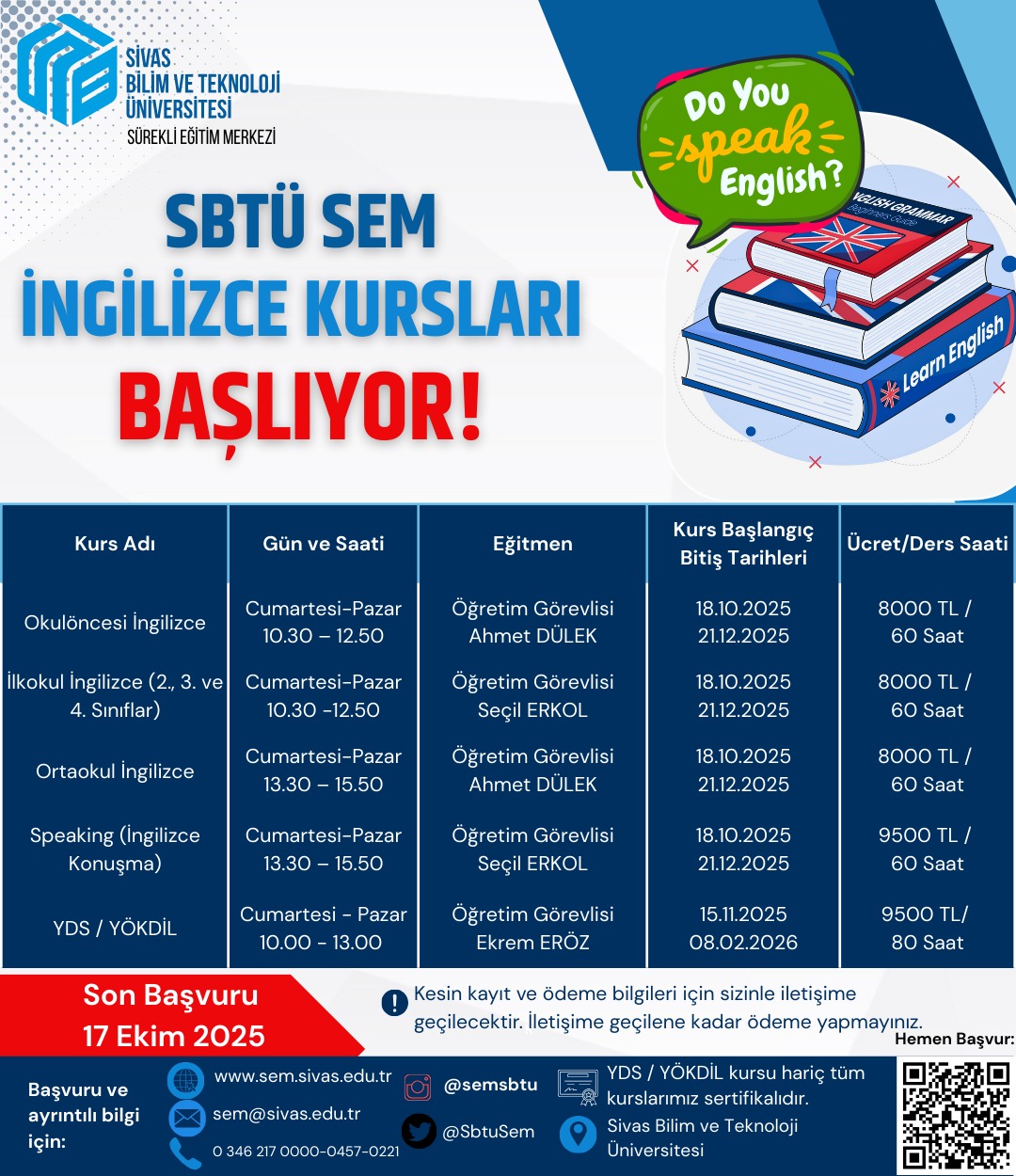 SBTÜ’nün uzman kadrosundan en modern yöntemlerle zenginleştirilmiş İngilizce eğitimi için başvurmakta geç kalmayın. Başvuru için tıklayınız.Son Başvuru: 17 Ekim 2025